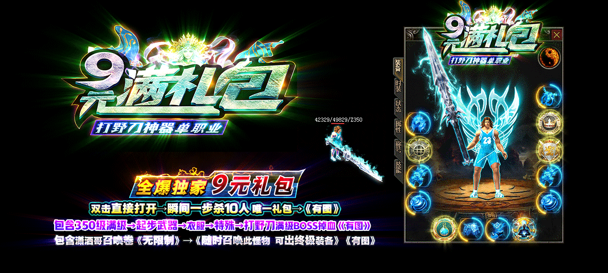 • 9元礼包→包含潇洒哥召唤卷《无限制》→《随时召唤此怪物,可出终极装备
